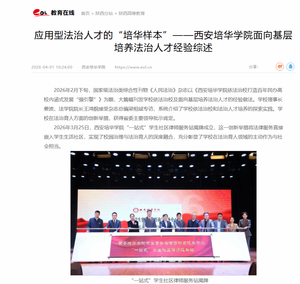 2026年3月25日,西安培华学院“一站式”学生社区律师服务站揭牌成立,这一创新举措将法律服务直接嵌入学生生活社区,实现了校园治理与法治育人的深度融合,充分彰显了学校在法治育人领域的主动作为与社会担当。