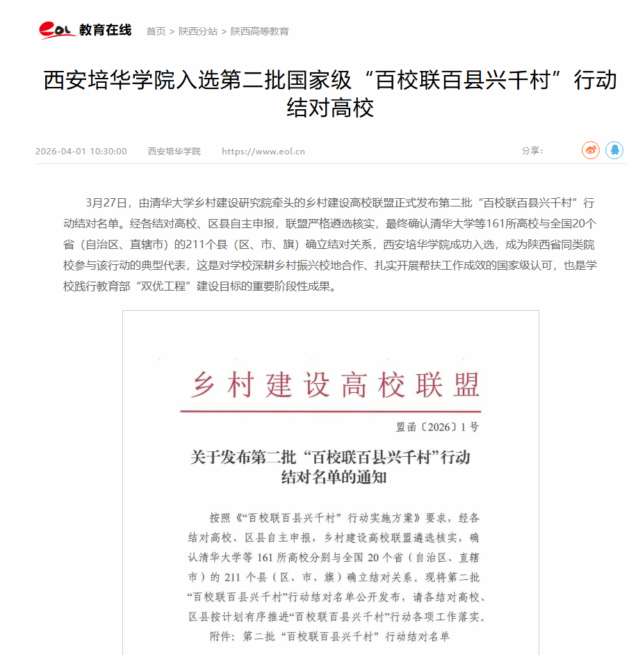 中国教育在线:西安培华学院入选第二批国家级“百校联百县兴千村”行动结对高校