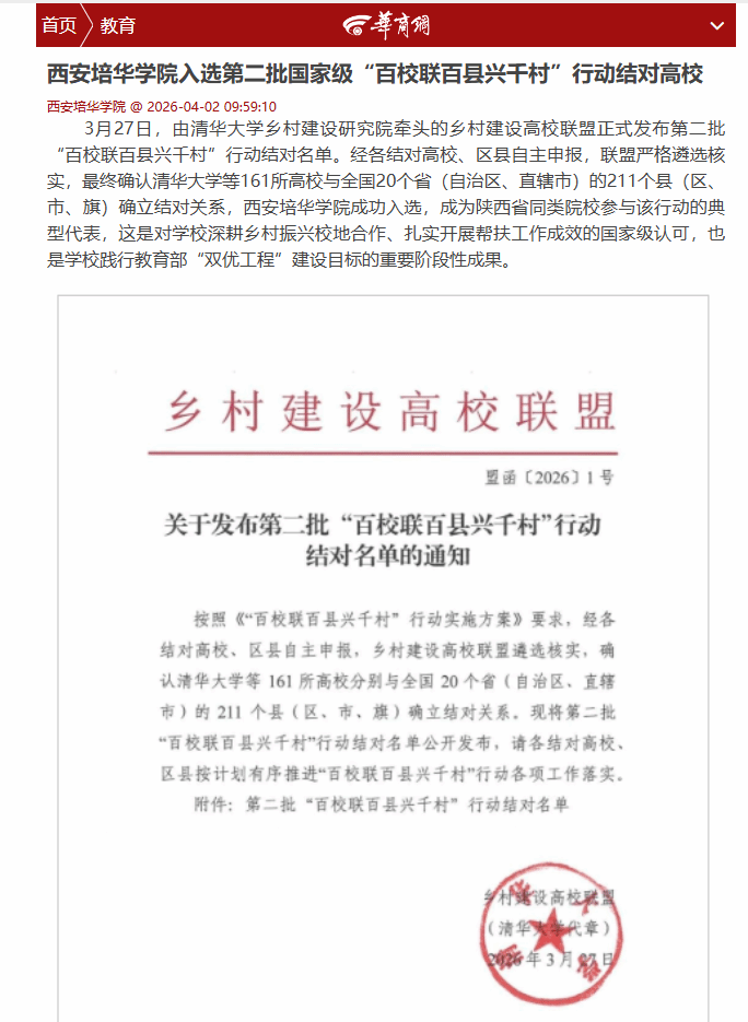 华商网:西安培华学院入选第二批国家级“百校联百县兴千村”行动结对高校 西安培华学院
