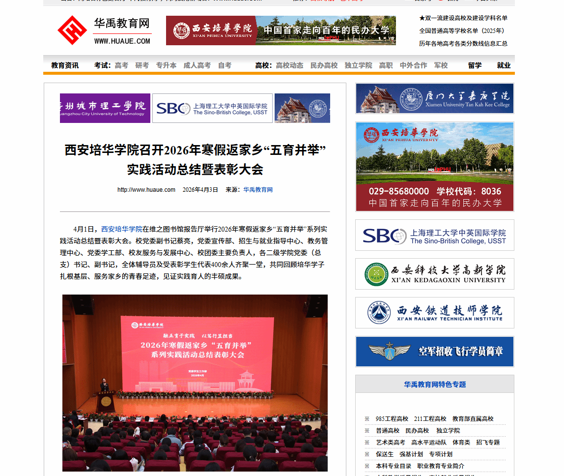 4月1日,西安培华学院在维之图书馆报告厅举行2026年寒假返家乡“五育并举”系列实践活动总结暨表彰大会。校党委副书记蔡亮,党委宣传部、招生与就业指导中心、教务管理中心、党委学工部、校友服务与发展中心、校团委主要负责人,各二级学院党委(总支)书记、副书记,全体辅导员及受表彰学生代表400余人齐聚一堂,共同回顾培华学子扎根基层、服务家乡的青春足迹,见证实践育人的丰硕成果。