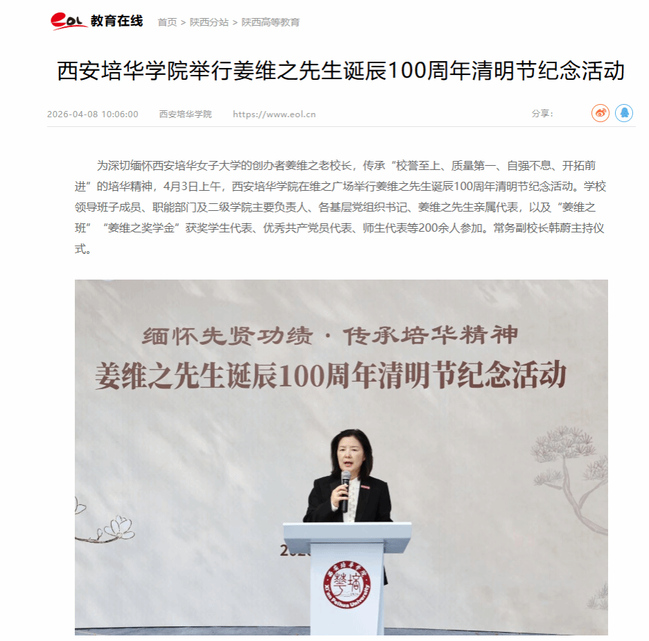 百年薪火,赓续不绝;教育报国,初心如磐。姜维之先生以一生践行 “人生的价值在于奉献” 的崇高信念,其精神早已沉淀为培华最深厚的文化基因,融入一代代培华人的血脉肌理。站在新的历史坐标上,西安培华学院始终以先生精神为指引,锚定 “强本申硕” 高质量发展航向,在民办高等教育的沃土上深耕细作、笃行不怠。全体培华人将以此次百年诞辰纪念活动为新的契机,承先生之遗志、扬奋进之风帆,在建设特色鲜明的高水平应用型民办大学的征程上勇毅前行,为中国高等教育事业的蓬勃发展注入更多培华力量、贡献更多培华智慧。
