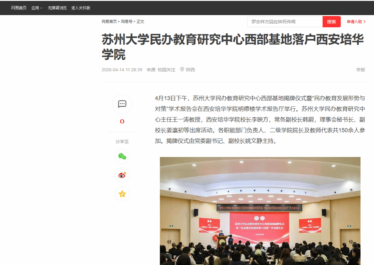 网易新闻:苏州大学民办教育研究中心西部基地落户西安培华学院
