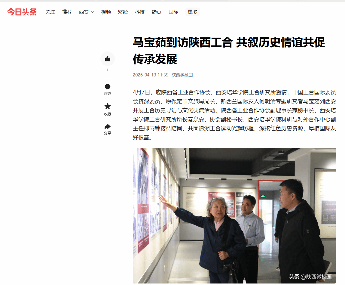 4月7日,应陕西省工业合作协会、西安培华学院工合研究所邀请,中国工合国际委员会资深委员、原保定市文旅局局长、新西兰国际友人何明清专题研究者马宝茹到西安开展工合历史寻访与文化交流活动。陕西省工业合作协会副理事长兼秘书长、西安培华学院工合研究所所长秦泉安,协会副秘书长、西安培华学院科研与对外合作中心副主任柳雨等接待陪同,共同追溯工合运动光辉历程,深挖红色历史资源,厚植国际友好根基。