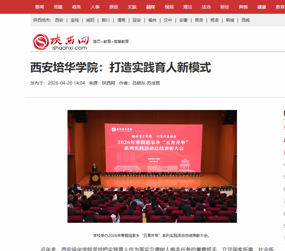 近年来,西安培华学院坚持把实践育人作为落实立德树人根本任务的重要抓手,立足国家所需、社会所盼、产业所向,以四维课堂贯通、上下联动协同、五育融合落地为核心路径,深化产教融合、校地合作、科教融汇,进一步拓展实践育人空间和阵地,组织学生走出课堂、走进社会、走向国家最需要的地方,在基层治理、乡村振兴、产业升级、文化传承等领域锤炼能力,构建起从课内延伸至课外、从校内拓展到校外、从线下延伸到线上全链条实践育人体系,形成了“课堂教学—实践锻炼—社会服务—就业衔接”具有培华特色的实践育人闭环。