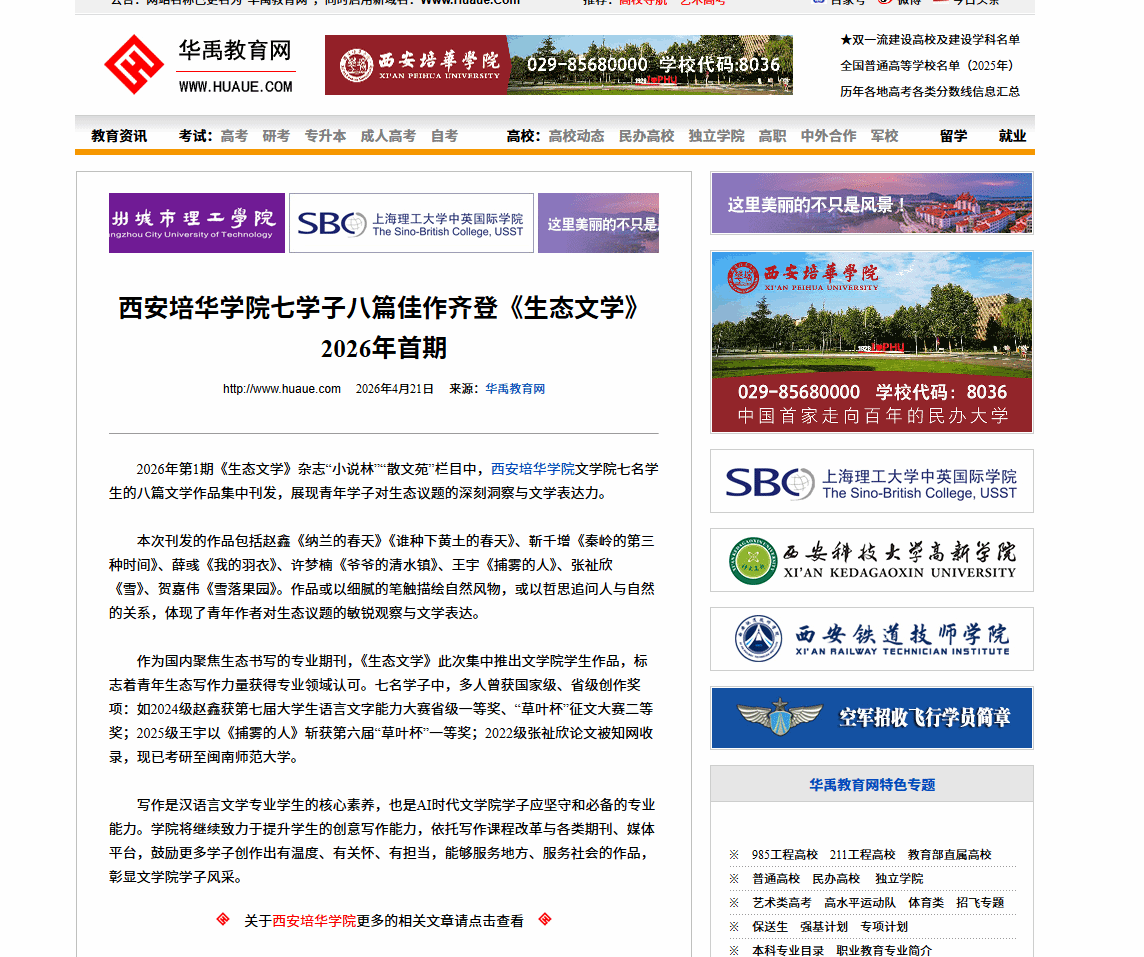 2026年第1期《生态文学》杂志“小说林”“散文苑”栏目中,西安培华学院文学院七名学生的八篇文学作品集中刊发,展现青年学子对生态议题的深刻洞察与文学表达力。