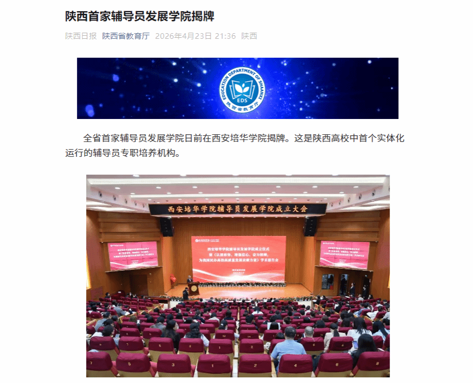 全省首家辅导员发展学院日前在西安培华学院揭牌。这是陕西高校中首个实体化运行的辅导员专职培养机构。