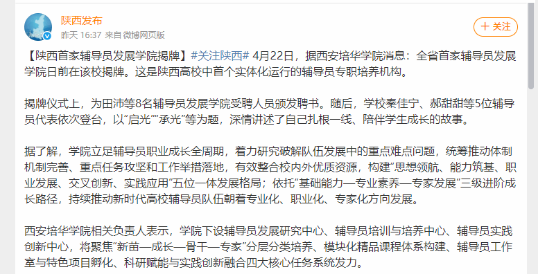 陕西发布:陕西首家辅导员发展学院揭牌