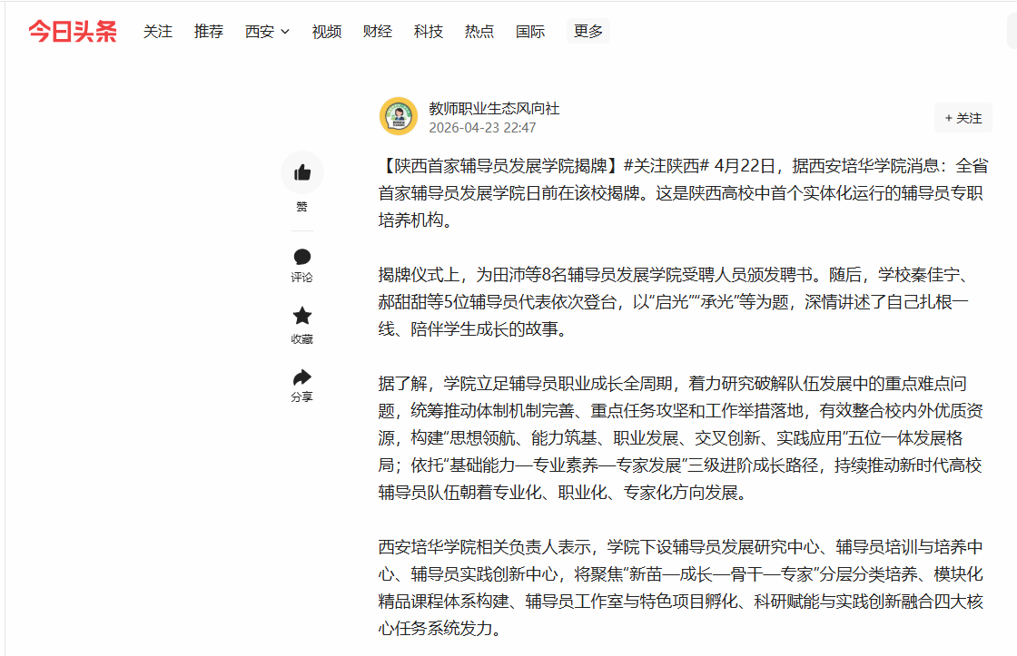 4月22日,据西安培华学院消息:全省首家辅导员发展学院日前在该校揭牌。这是陕西高校中首个实体化运行的辅导员专职培养机构。