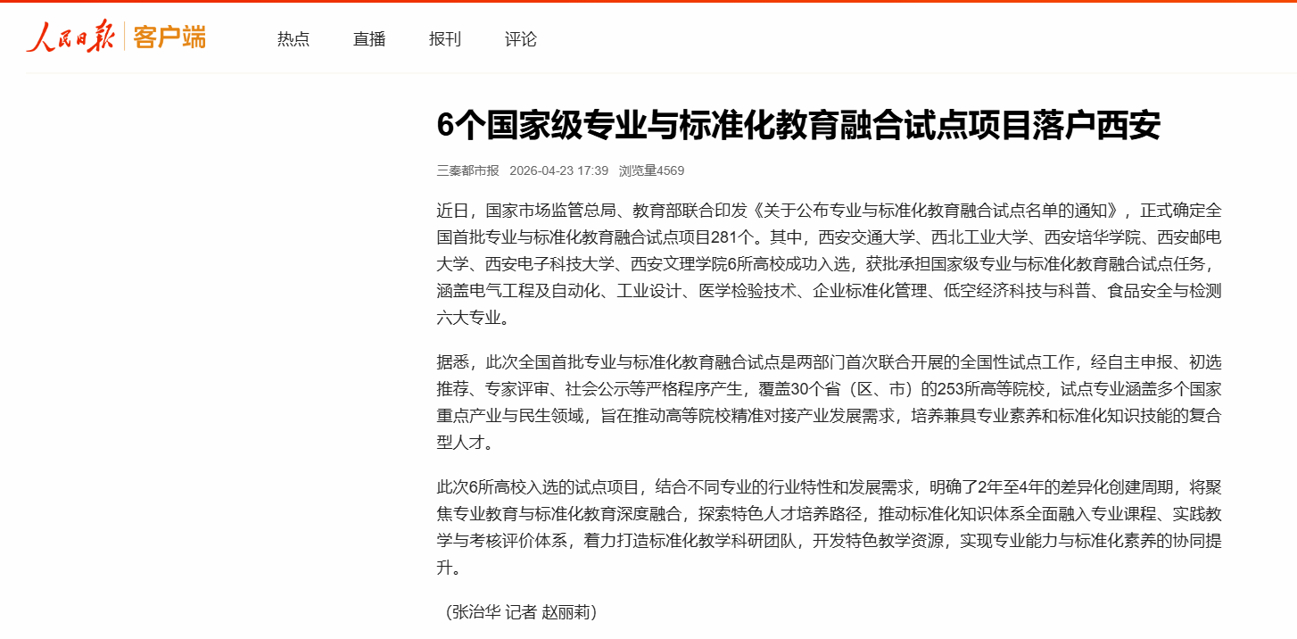 近日,国家市场监管总局、教育部联合印发《关于公布专业与标准化教育融合试点名单的通知》,正式确定全国首批专业与标准化教育融合试点项目281个。其中,西安交通大学、西北工业大学、西安培华学院、西安邮电大学、西安电子科技大学、西安文理学院6所高校成功入选,获批承担国家级专业与标准化教育融合试点任务,涵盖电气工程及自动化、工业设计、医学检验技术、企业标准化管理、低空经济科技与科普、食品安全与检测六大专业。
