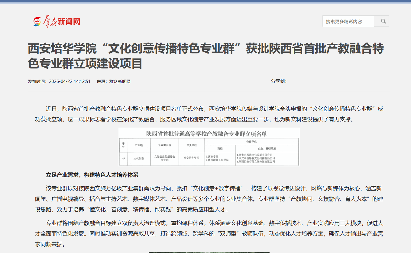 群众新闻网:西安培华学院“文化创意传播特色专业群”获批陕西省首批产教融合特色专业群立项建设项目