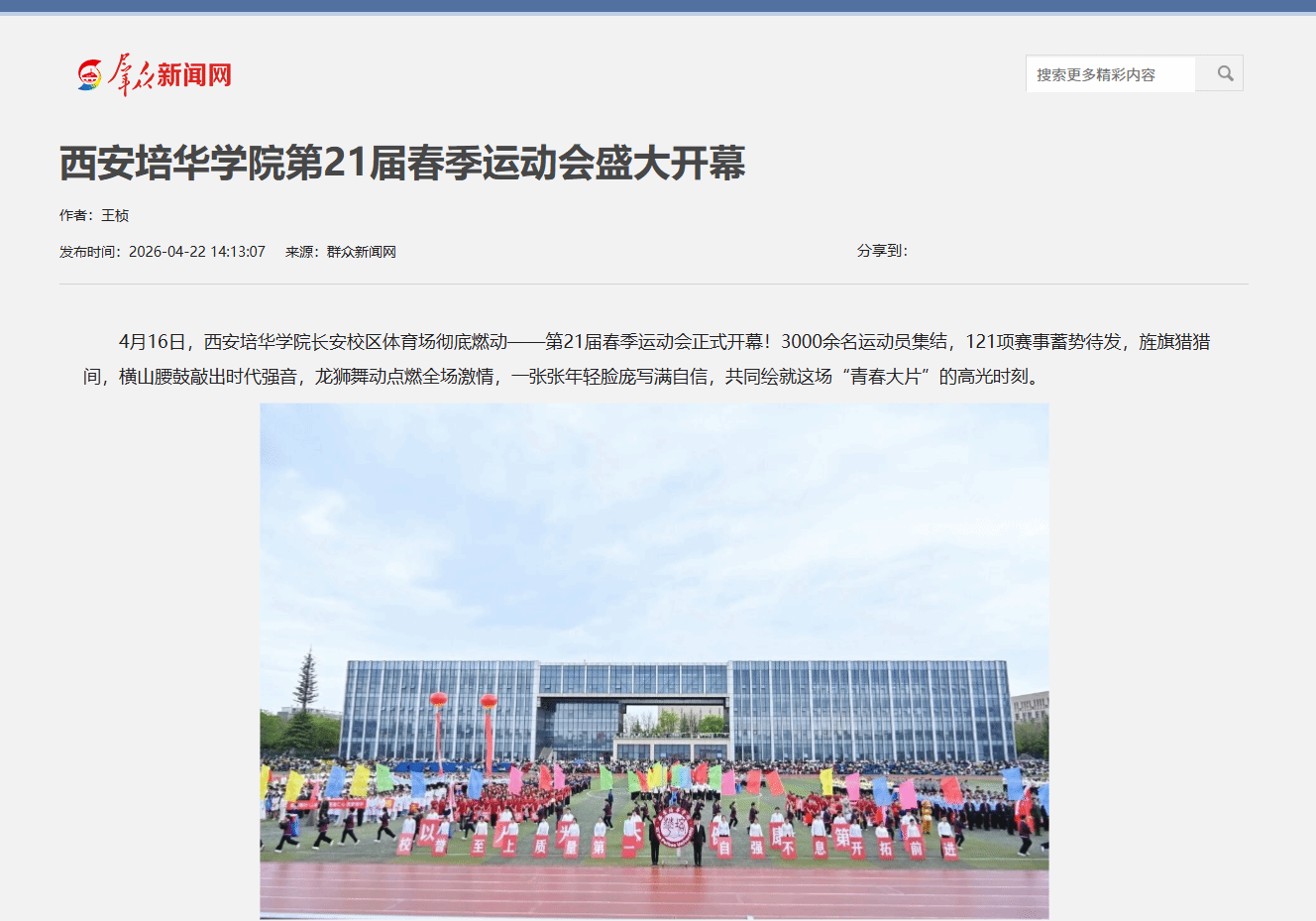 4月16日,西安培华学院长安校区体育场彻底燃动——第21届春季运动会正式开幕!3000余名运动员集结,121项赛事蓄势待发,旌旗猎猎间,横山腰鼓敲出时代强音,龙狮舞动点燃全场激情,一张张年轻脸庞写满自信,共同绘就这场“青春大片”的高光时刻。