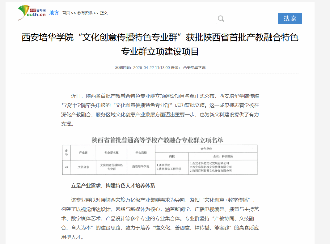 近日,陕西省首批产教融合特色专业群立项建设项目名单正式公布,西安培华学院传媒与设计学院牵头申报的“文化创意传播特色专业群”成功获批立项。这一成果标志着学校在深化产教融合、服务区域文化创意产业发展方面迈出重要一步,也为新文科建设提供了有力支撑。
