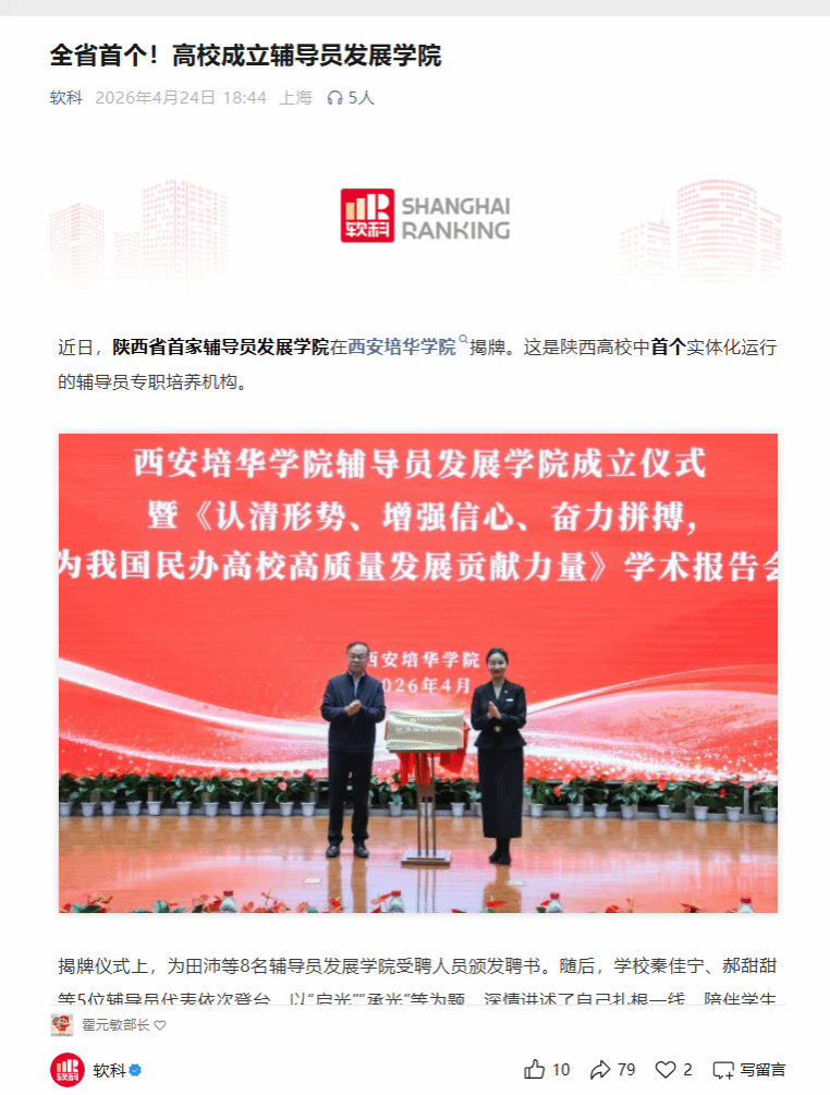 近日,陕西省首家辅导员发展学院在西安培华学院揭牌。这是陕西高校中首个实体化运行的辅导员专职培养机构。
