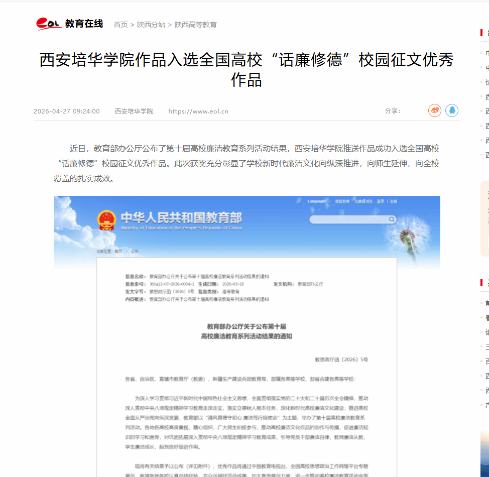 近日,教育部办公厅公布了第十届高校廉洁教育系列活动结果,西安培华学院推送作品成功入选全国高校“话廉修德”校园征文优秀作品。此次获奖充分彰显了学校新时代廉洁文化向纵深推进,向师生延伸、向全校覆盖的扎实成效。