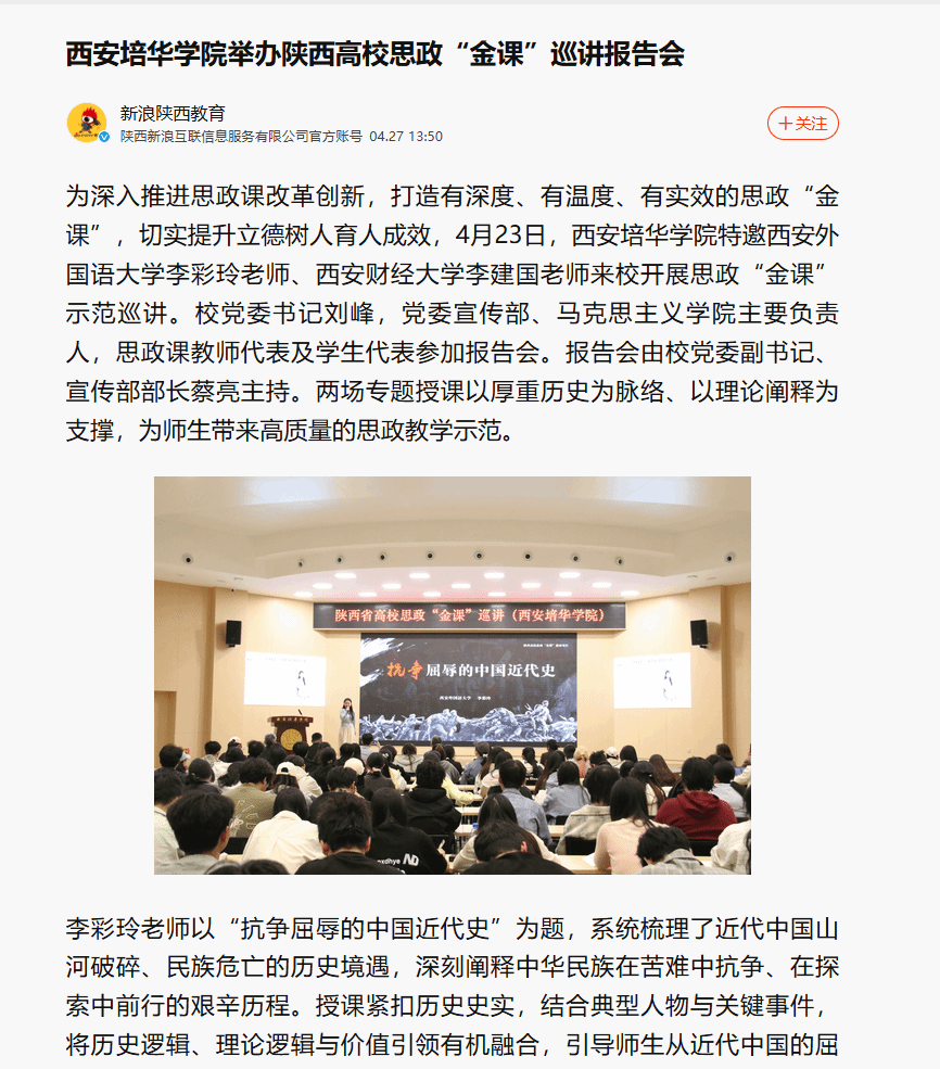 为深入推进思政课改革创新,打造有深度、有温度、有实效的思政“金课”,切实提升立德树人育人成效,4月23日,西安培华学院特邀西安外国语大学李彩玲老师、西安财经大学李建国老师来校开展思政“金课”示范巡讲。校党委书记刘峰,党委宣传部、马克思主义学院主要负责人,思政课教师代表及学生代表参加报告会。报告会由校党委副书记、宣传部部长蔡亮主持。两场专题授课以厚重历史为脉络、以理论阐释为支撑,为师生带来高质量的思政教学示范。