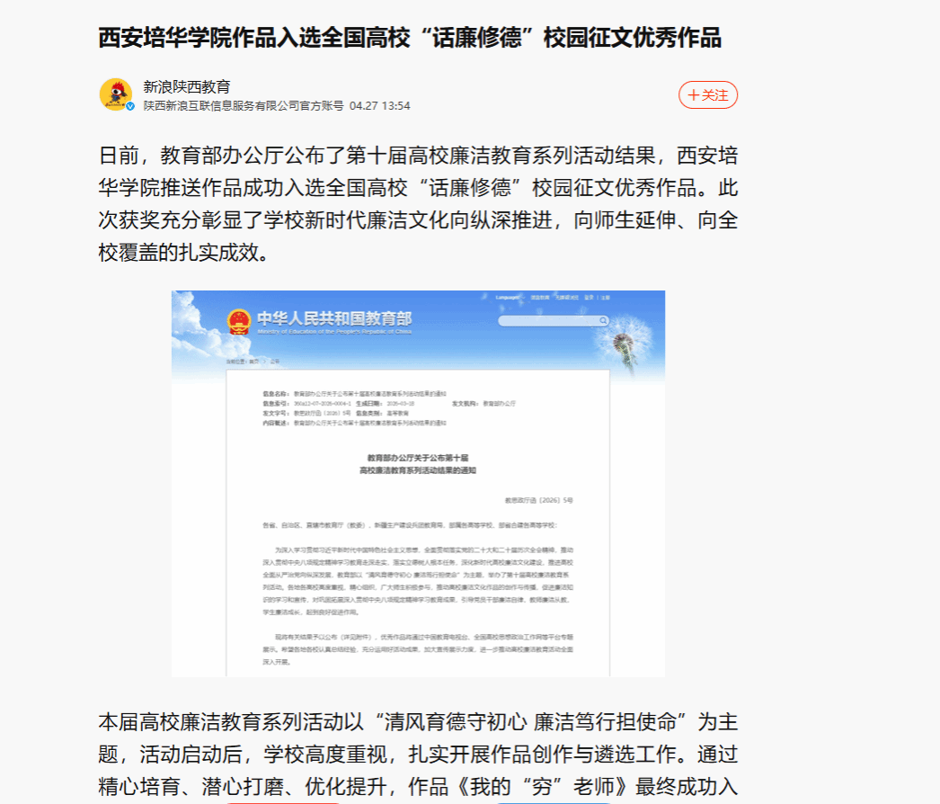 近日,教育部办公厅公布了第十届高校廉洁教育系列活动结果,西安培华学院推送作品成功入选全国高校“话廉修德”校园征文优秀作品。此次获奖充分彰显了学校新时代廉洁文化向纵深推进,向师生延伸、向全校覆盖的扎实成效。