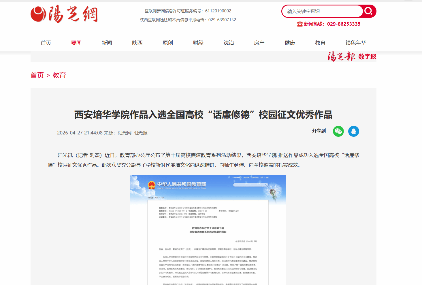 阳光网:西安培华学院作品入选全国高校“话廉修德”校园征文优秀作品