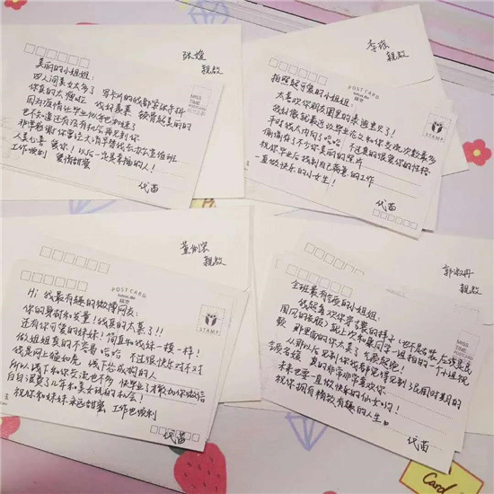 代苗说每写一张明信片就是一次青春回忆,回忆起和这位同学发生的故事回忆起这位同学所有的闪光点。虽然,经常写着写着都会掉眼泪,但还是无比怀念大学的时光。代苗说之所以想到这种方式来告别是因为她想用文字告诉大学同学毕业之后一定不要失去联系,永远记得我们是一家人。