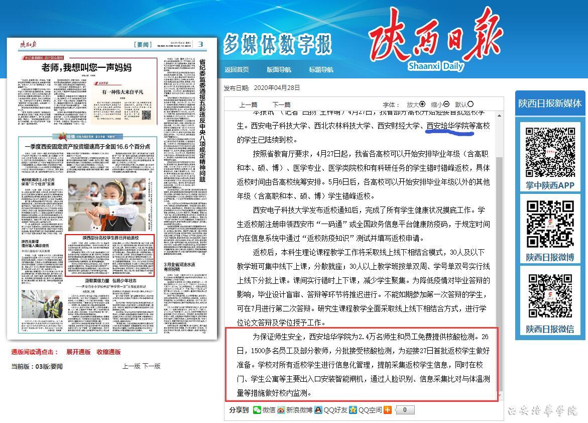 为保证师生安全,西安培华学院为2.4万名师生和员工免费提供核酸检测。26日,1500多名员工及部分教师,分批接受核酸检测,为迎接27日首批返校学生做好准备。学校对所有返校学生进行信息化管理,提前采集返校学生信息,同时在校门、学生公寓等主要出入口安装智能闸机,通过人脸识别、信息采集比对与体温测量等措施做好校内监测。