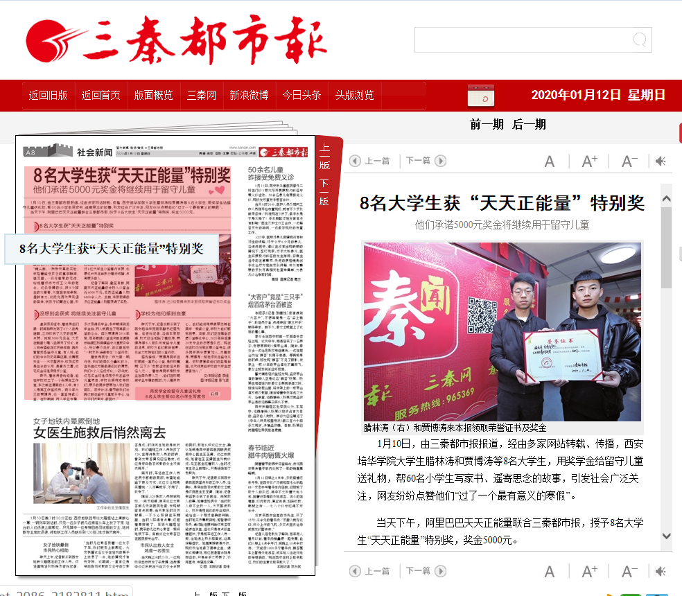 当天下午,阿里巴巴天天正能量联合三秦都市报,授予8名大学生“天天正能量”特别奖,奖金5000元。
