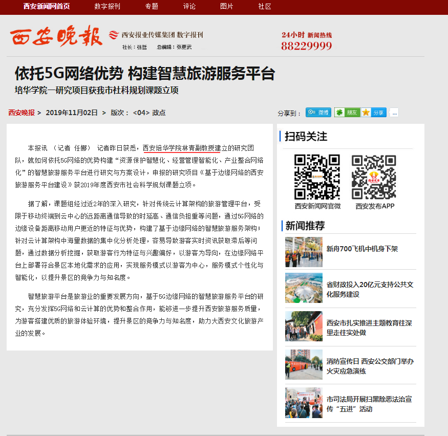 本报讯 (记者 任娜) 记者昨日获悉,西安培华学院林青副教授建立的研究团队,就如何依托5G网络的优势构建“资源保护智慧化、经营管理智能化、产业整合网络化”的智慧旅游服务平台进行研究与方案设计,申报的研究项目《基于边缘网络的西安旅游服务平台建设》获2019年度西安市社会科学规划课题立项。