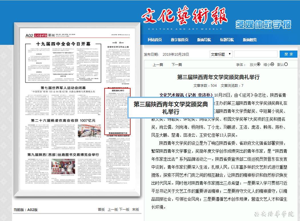 文化艺术报讯(记者 李济朴)10月25日,由《延河》杂志社、陕西省青年文学协会、陕西省青年企业家协会主办的第三届陕西青年文学奖颁奖典礼在西安培华学院举行。现场颁发了第三届陕西青年文学贡献奖、中短篇小说奖、散文奖、诗歌奖、评论奖、网络文学奖、校园文学奖等7大奖项的主奖和提名奖,肖云儒、刘尚海、杨则纬、丁小龙、马鹏波、王洁、庞洁、韩伟、陈朴、风圣大鹏、楚清、田凌云、王安忆佳等13人获奖。