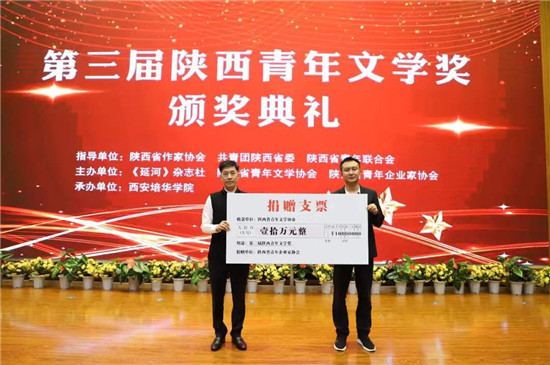 典礼现场,陕西省青年企业家协会向陕西省青年文学协会捐赠十万元,用于第三届陕西青年文学奖的颁发。