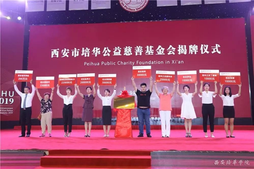 仪式上,西安市培华公益慈善基金会理事长薛清、监事姜波,陕西睿信云财务管理有限公司总经理田菁,1954届毕业生蔡培华共同为“西安市培华公益慈善基金会”揭牌,该基金会是以培华命名的公益慈善组织,所募资金将广泛用于救孤、去病、助残、助医、助学、扶贫、济困等公益慈善社会活动。基金会成立以后,一批单位,教师和校友为基金会捐赠资金,部分捐赠代表到现场出席活动。