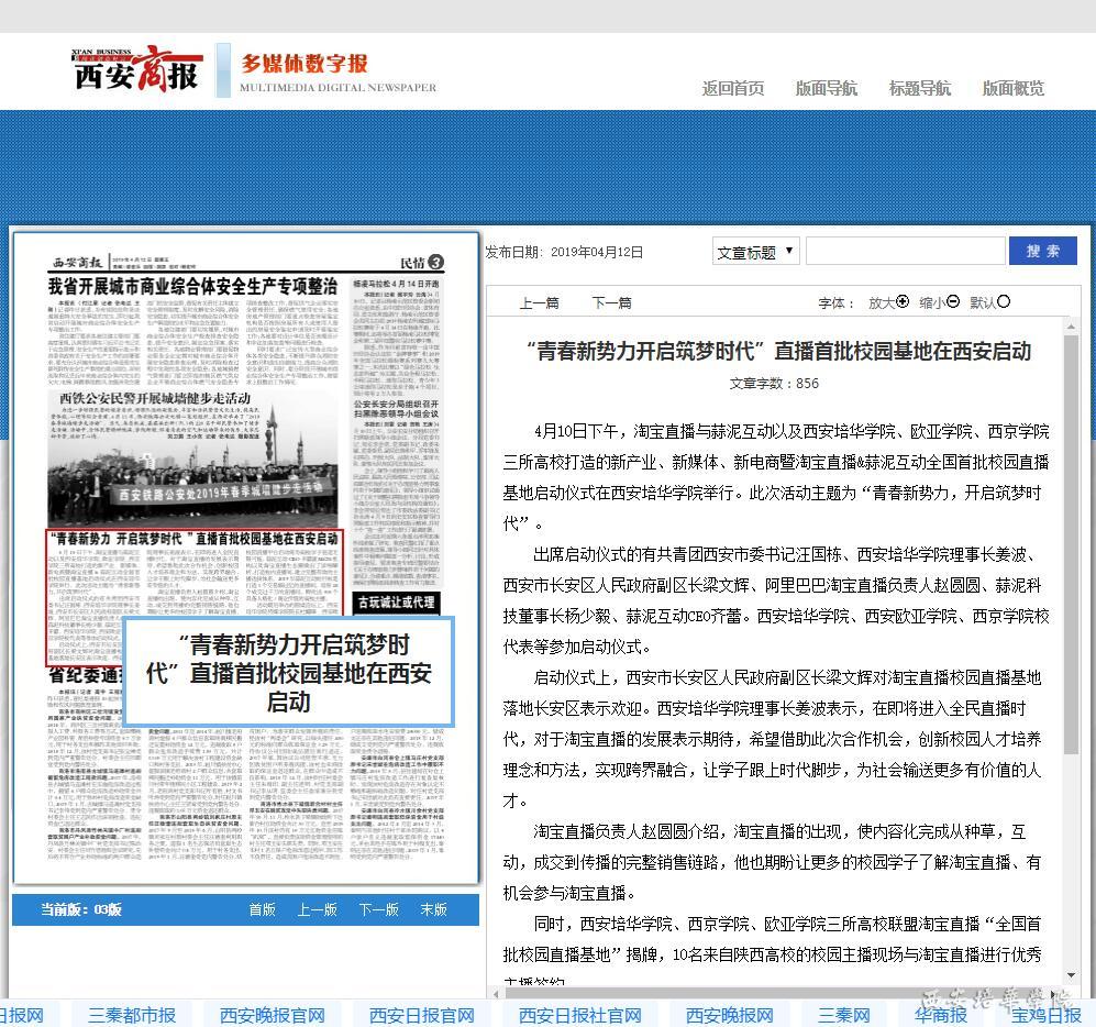 同时,西安培华学院、西京学院、欧亚学院三所高校联盟淘宝直播“全国首批校园直播基地”揭牌,10名来自陕西高校的校园主播现场与淘宝直播进行优秀主播签约。