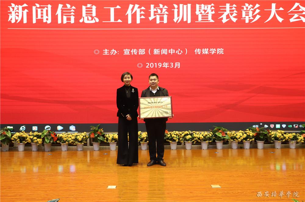 党委副书记、副校长姚文静宣读表彰文件。与会领导为荣获新闻信息工作“先进集体”、“先进工作者”、“优秀信息员”、“培华好新闻”获得者颁发荣誉证书。现场还颁发了一个特殊的奖项“培华2018最具网络影响力奖”,该奖项是在去年年终,新闻中心联合陕西传媒网在校内做了一个最有魅力院系的评选活动,经过网络投票,最终会计与金融学院荣获该项表彰。