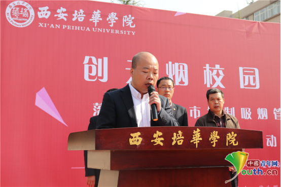 学生代表王奕霖在宣读《西安培华学院控烟倡议书》中表示,学校控烟工作是教育工作的重要内容,开展全校性的禁烟活动,建设无烟学校,是安全文明校园建设的一个重要组成部分,是新时期加强学生思想道德建设的一项重要内容,是学校关心师生身心健康的具体行动。要从根本出发,从即刻出发,从自身出发,打造无烟健康校园生活。