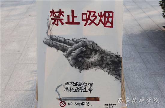 该校利用网站、微博、微信等线上平台宣传《西安市控制吸烟管理办法》,发起《西安培华学院控烟倡议书》,号召全校师生共同努力,为建设“无烟培华、健康培华”贡献力量。此外,该校还组织开展了“戒烟主题手抄报展”活动,该校建筑与艺术设计学院师生手绘50余幅主题宣传海报,在学校人群密集的广场展出,号召广大师生珍爱健康,远离香烟。