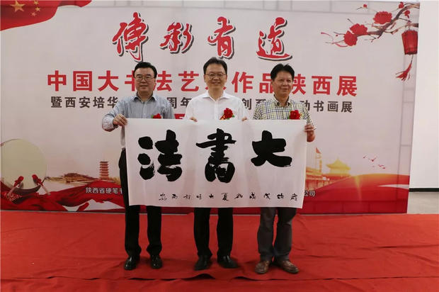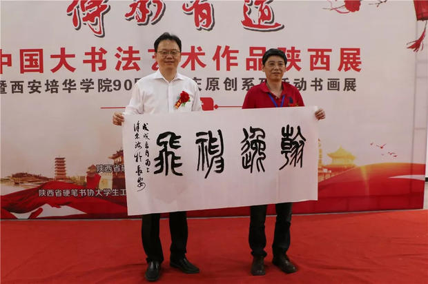 今天下午,“传承有道”中国大书法艺术作品陕西展暨西安培华学院90周年校庆原创系列活动书画展在汇知楼现代艺术馆举行。著名书法家、中国硬笔书法协会主席、民进中央开明画院副院长张华庆,中国硬笔书法协会副主席、陕西省硬笔书法家协会主席、民进陕西开明书画院院长、陕西省书法家协会副主席高继承,宁波市文联原党组书记、宁波市硬笔书法家协会名誉主席邹大鸣,陕西省政协常委、西安培华学院理事长姜波,党委书记胡俊生,副校长、党委副书记姚文静及众多书法家、师生代表近百余人参加了此次活动。