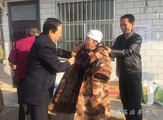 西安培华学院党委书记胡俊生为贫困户试穿棉大衣