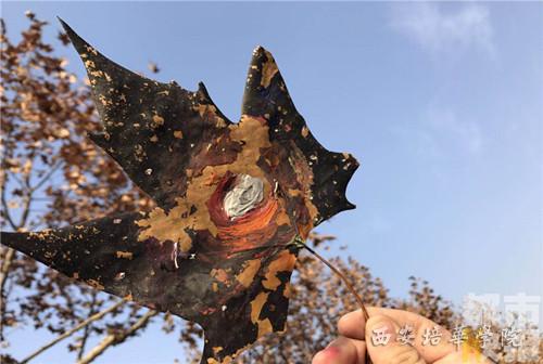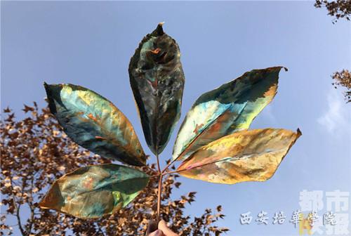 在冬天的校园里,捡上一片树叶,涂涂画画,这是西安培华学院视觉传达专业大二学生李康的主意。