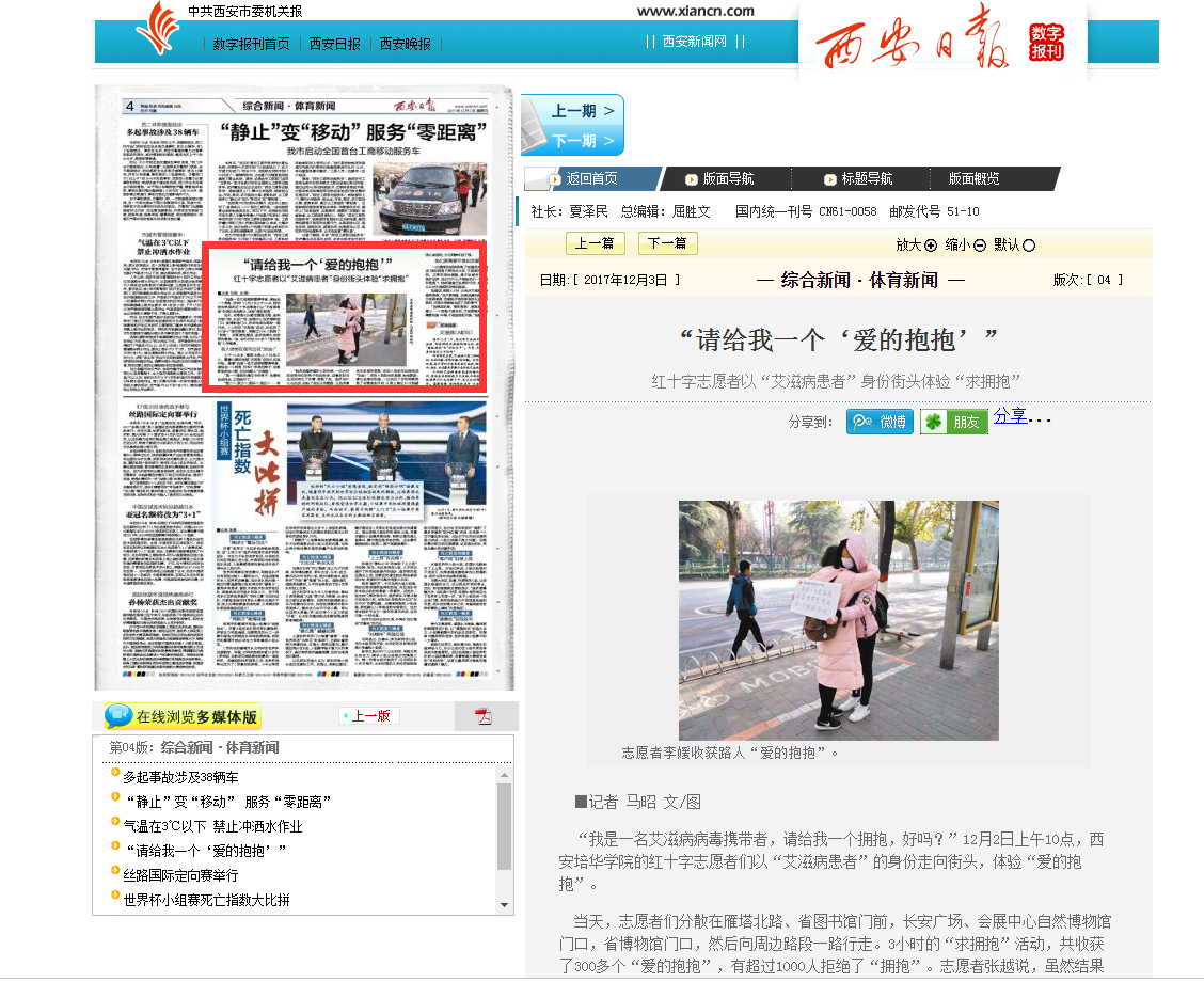 西安日报:“请给我一个‘爱的抱抱’” 红十字志愿者以“艾滋病患者”身份街头体验“求拥抱”