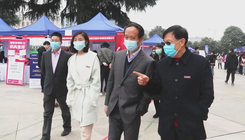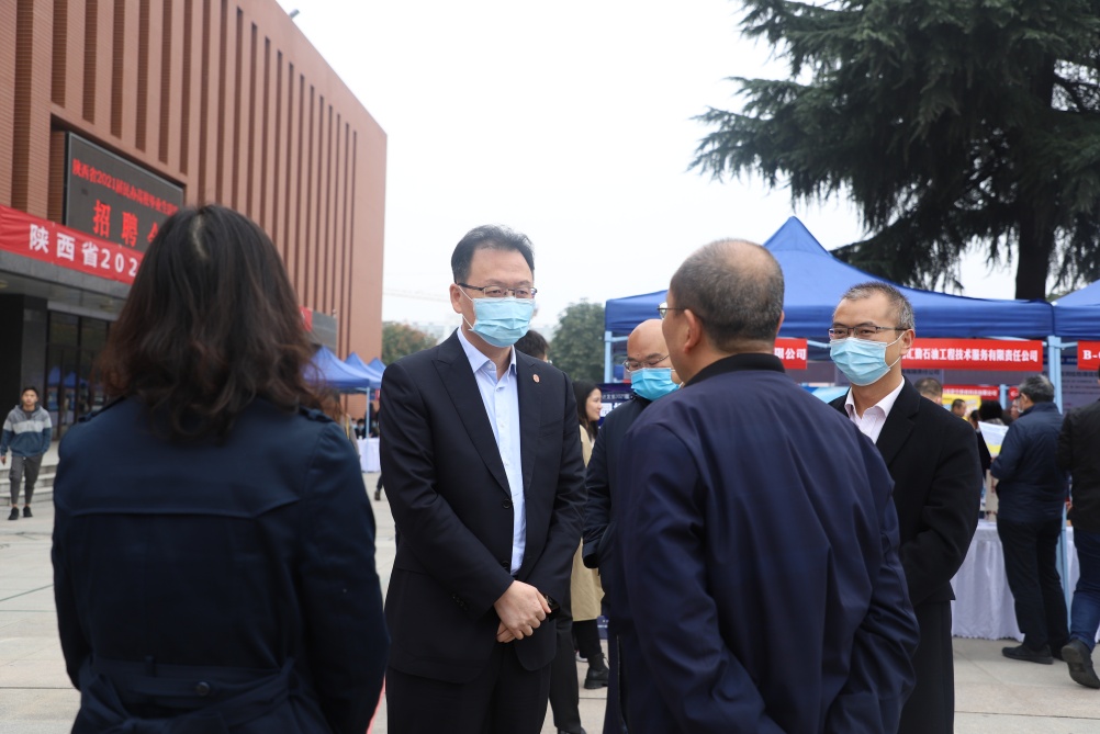 招聘会现场,陕西省教育工委、陕西省教育厅一级巡视员朱征南,西安培华学院理事长姜波、校长李映方、党委副书记、副校长姚文静,陕西省教育厅高校学生工作处三级调研员白炀,陕西省高等学校毕业生就业服务中心主任陈靖,西安翻译学院、西安外事学院、西安思源学院等就业部门负责人,学生服务中心、各二级学院领导到现场调研指导。与现场用人单位招聘负责人就招聘单位的人才需求、疫情对于单位招聘工作的影响以及对高校人才培养的意见建议等方面进行沟通。