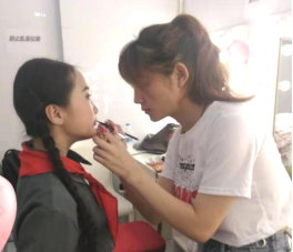 播音与主持艺术专业大二学生任碧莹同学在翟羽佳老师的指导下,也参与了化妆造型工作,把理论所学很好地运用到了实践当中。