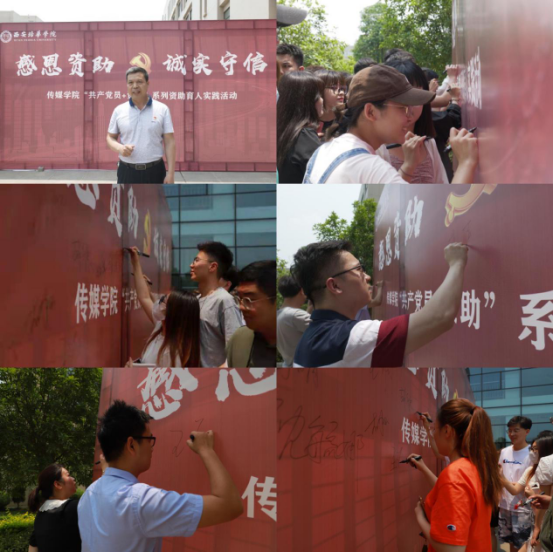——践行承诺,恪守诚信。传媒学院开展以“感恩资助 诚实守信”为主题的“共产党员+资助”系列资助育人实践活动启动仪式,传媒学院全体共产党员以及获奖受助学生参加了本次活动。传媒学院党委书记兼江俊瑞院长在讲话中指出:“资助育人、感恩诚信,我们要把它转化为学习动力,我们学生要学习好专业,把诚信做好,把生活过好,为国家伟大复兴贡献力量!”与会老师、学生一同在诚信墙庄重的签上了自己的名字,并承诺一定要诚实守信,共同为中华民族伟大复兴的中国梦贡献青年力量!