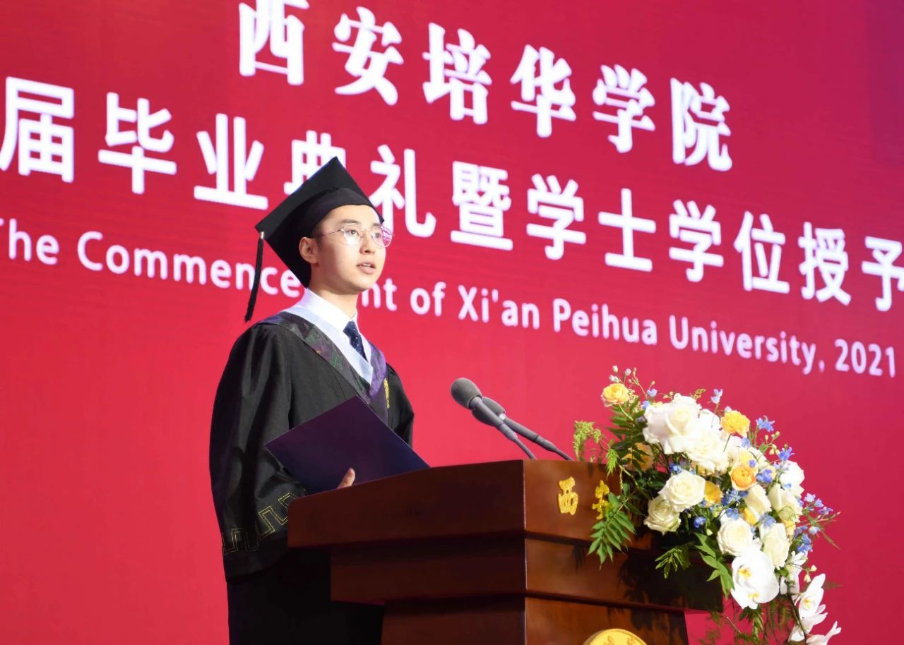 会计与金融学院2021届毕业生李煜作为毕业生代表上台发言,他感恩了学校、老师及家人的无私守护,回顾了在培华砥砺品格、锤炼意志的青春岁月。他讲到,我们都在不同的领域里挥洒青春汗水,建设美丽中国,我们必将讲好培华故事,传播培华声音。并表示作为培华人将用筑梦奋斗的精神发出时代的声音,向祖国告白,向青春献礼,毕业离校后将带着勇敢的心,一路向前,与培华精神相伴,一路向前。