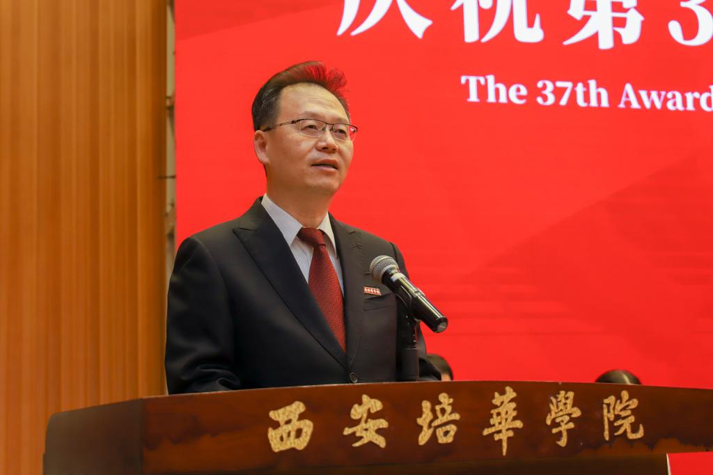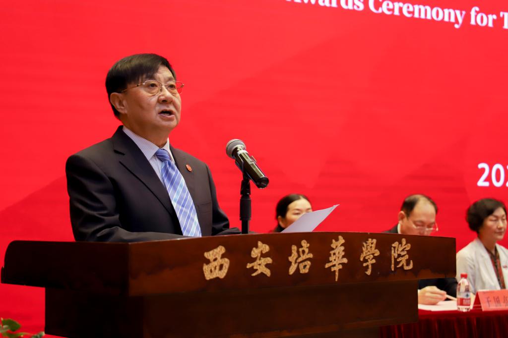 党委副书记、工会主席徐国富教授宣读《西安培华学院工会关于表彰2021年光荣从教满20年人员的决定》《西安培华学院关于第二届最美教师和最美职员评选结果的通报》