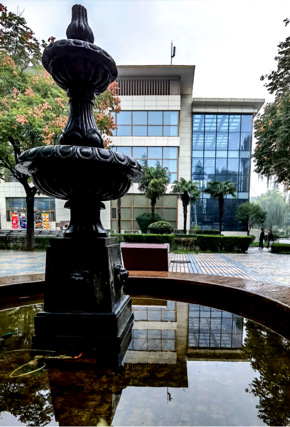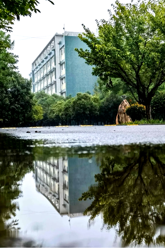 “水天溶漾画桡迟,人影鉴中移。”风平雨静时,维之图书馆、至善楼...同雨中倒影相映成趣。