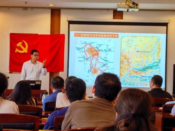 9月29日下午,西安培华学院马克思主义学院院长田亮教授在中科尚诚酒店第一会议室为中国科学院西安精密光学机械研究所装校技术研究中心全体党员做《陕甘边根据地的斗争与中国共产党的革命精神》专题辅导报告。