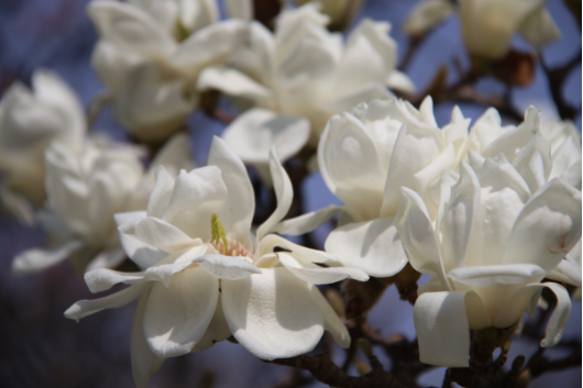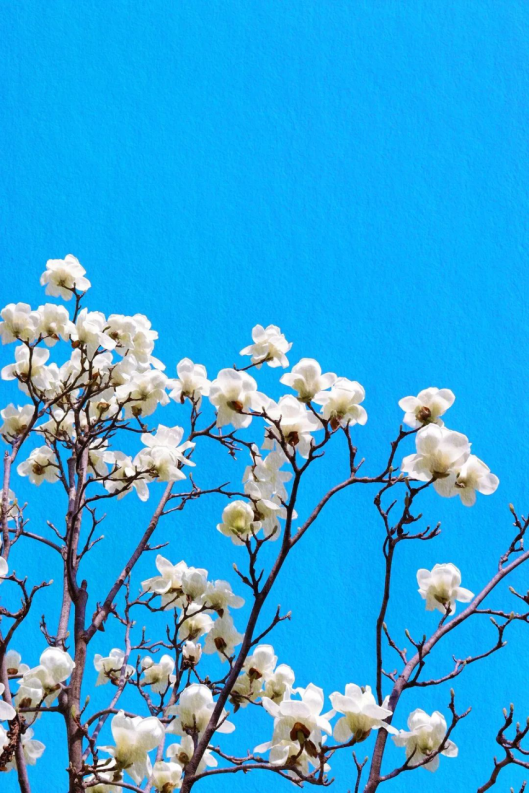 美丽的玉兰在绿叶尽无的枝干上摇曳,娇艳欲滴,煞是好看,如同静蓝天空白云悠然,含笑淡然,瞬间绽放久违的好心情。