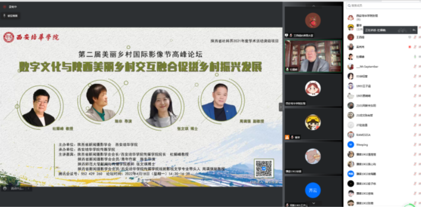 4月18日下午,由陕西省新闻摄影学会、西安培华学院主办,西安培华学院传媒学院承办的陕西省社科界社会组织学术活动资助项目“第二届美丽乡村国际影像节高峰论坛”在西安培华学院举办,受疫情影响,本次论坛采用腾讯会议线上形式展开。论坛主题为“数字文化与陕西美丽乡村交互融合促进乡村振兴发展”,由陕西省新闻摄影学会副会长、西安培华学院传媒学院常务副院长王西娅教授主持。