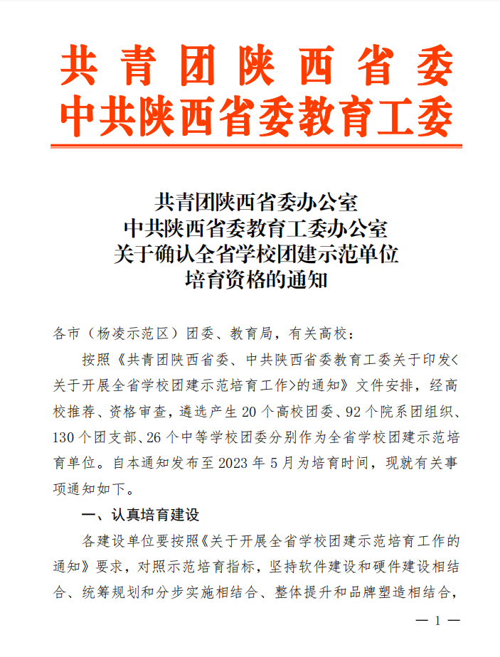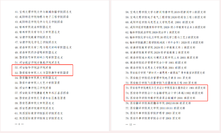 近日,在共青团陕西省委、中共陕西省委教育工委公布的全省高校团建示范单位培育名单中,我校医学院团委、人文与国际教育学院团委入选“全省高校团建标杆院系”培育单位名单;建筑与艺术设计学院服装与服饰设计1901班团支部、会计与金融学院会计学(卓越)1902班团支部、传媒学院新闻学2001班团支部入选“全省高校团建样板支部”培育单位名单。