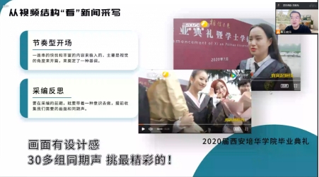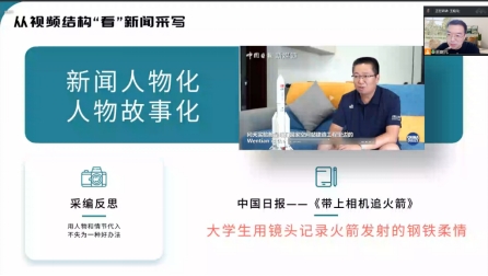 王庭元校友用充满激情的语言,通过聊天的方式,引用了大量生动的例子,从划不走、讲故事、说干货、持续升华、精神传承包容五个方面,就视频新闻如何采写这一话题,展开了内容,他表示为使视频新闻信息形成独特的风格,新闻编辑必须创新思路,寻找切口,注重细节,代入节奏,并增加自身对于新闻的素质和能力要求。他还说,“我们写出好新闻,做好宣传思想工作,就要牢牢把握主动权,主动出击,等新闻出现,不如出去找新闻。树立创新思维,心中要常有好思路,想别人想不到的。”