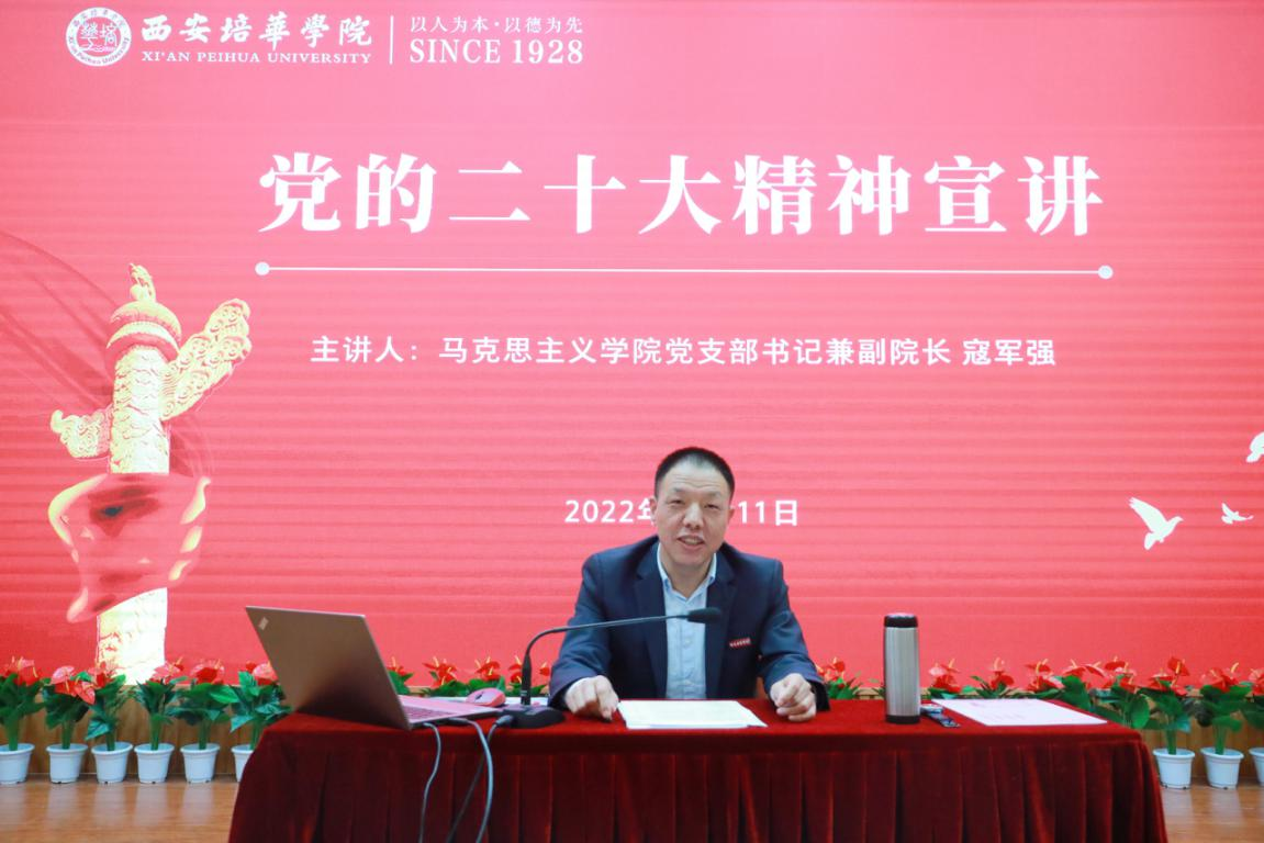 11月11日,西安培华学院马克思主义学院副院长寇军强为西安培华学院师生进行党的二十大精神宣讲。活动以线上线下的形式进行,各二级学院书记、副书记、教师代表、学生代表以及全体思政课教师在明德楼报告厅参加线下活动。