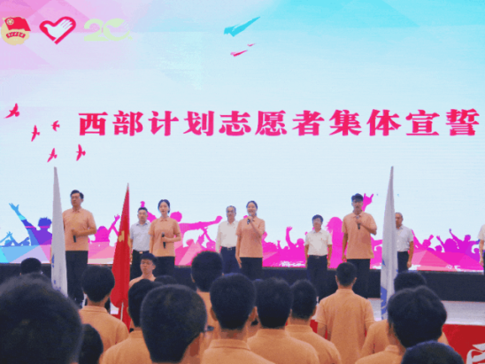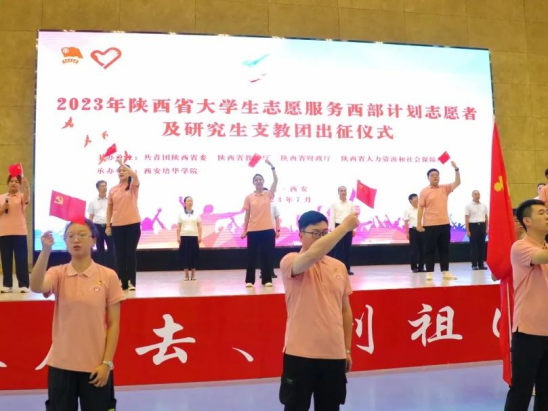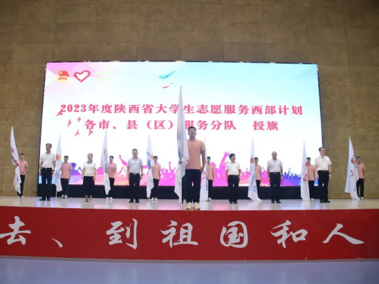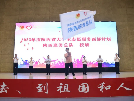 出征仪式上,与会领导为2022—2023年度陕西省大学生志愿服务西部计划先进集体和个人颁奖,为2023年陕西省大学生志愿服务西部计划陕西服务总队、研究生支教团和各市、县(区)服务分队授旗。全体志愿者庄严宣誓,集体发出了“清澈的爱,只为中国”的时代最强音,表达了新时代新青年在奉献西部地区建设中的坚定决心和青春誓言。