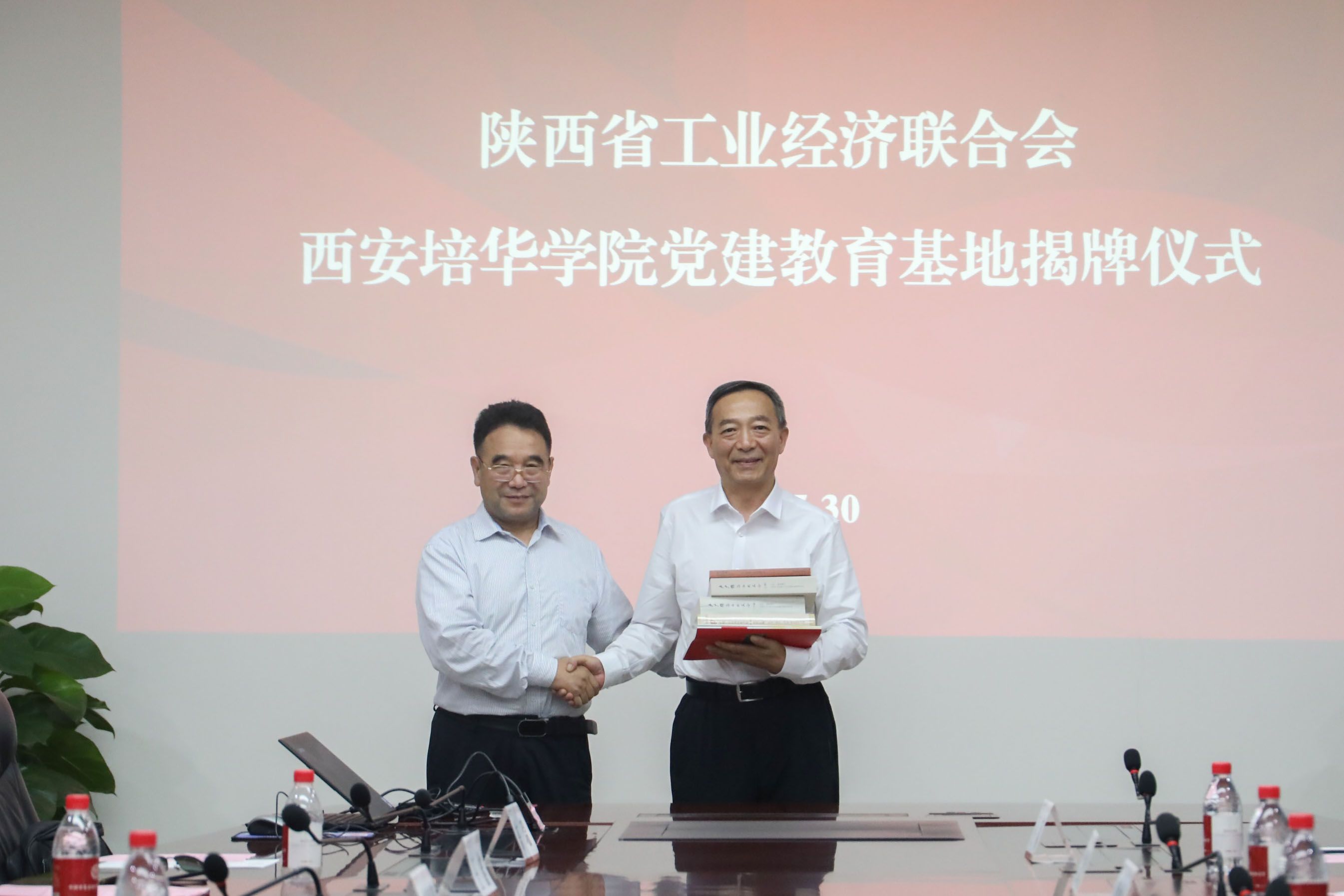 孙安会与姜波为陕西省工业经济联合会西安培华学院党建教育基地揭牌。